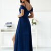 Elegant long dress with a wrap neckline, thin straps, and sleeves. The dress is cut at the waist, fastened with a hidden zipper, flared bottom with a slit. Made of flowing material with a sheen.