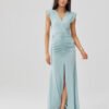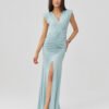 An elegant maxi dress with a fitted silhouette beautifully emphasizes the figure, while the gathering at the waist beautifully accentuates its shape. The wrap neckline and high slit on the leg add feminine sensuality and lightness to the styling. The model was made in Poland with attention to the smallest details, guaranteeing high quality and comfort of wearing. An additional advantage are the shoulder pads, which give the whole a distinctive character and subtly shape the shoulder line. It is a perfect choice for a wedding, reception or evening out, just pair it with heels, a clutch and jewelry to create an elegant, polished look.