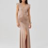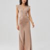 The elegant maxi dress with a fitted silhouette beautifully emphasizes the figure, while the ruching at the waist nicely accentuates its shape. The wrap neckline and high slit on the leg add feminine sensuality and lightness to the styling. The model was sewn in Poland with attention to the smallest details, which guarantees high quality workmanship and wearing comfort. An additional asset are the shoulder pads, which give the whole outfit a distinctive character and subtly shape the shoulder line. This is a perfect choice for a wedding, reception or evening out, just add heels, a clutch and jewelry to create an elegant, polished look.