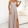 Imagine an evening when you want to look elegant and feel comfortable. This beige-pink maxi dress beautifully reflects light and is perfect for important occasions. If you are looking for a styling for a wedding or reception, this model will quickly become your ideal choice. The model has a gently falling water neckline and thin straps. The waist is marked with a cut, and the bottom falls freely in maxi length. There is a slit on the side for leg movement, and in the back, there is a striking corset lacing that allows you to adjust the dress to your silhouette. Made in Poland.