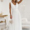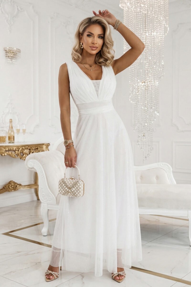 Imagine an evening when you enter the room and everything falls into place as it should. The light movement of the material with every step, softly emphasized waist and a light ecru color that looks fresh both in daylight and evening. This is a model in which you feel feminine and comfortable. The maxi dress delights with a well-crafted top with a wrap effect and a deeper V-neckline, which beautifully elongates the neck. The wide belt optically shapes the waist, and the delicate pleats add lightness to the silhouette. The bottom is a flowing, tulle layer with a subtle sheen that works in motion and creates an elegant, fluid line. At the back, attention is drawn to the spectacular finish of the neckline and the waist tie, which allows you to adjust the dress to your figure. If you are looking for a model that will make an impression, choose this ecru-colored wedding dress and let yourself be wowed in it. European production.