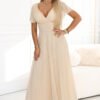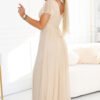 When the room lights up with golden light, and the looks momentarily stop at the entrance, only one thing matters: how do you feel in your creation. This maxi dress in a shade of champagne beige was created for moments when you want to look stunning and feminine. The subtle, shimmering finish gives a delicate glow effect that works beautifully in motion and in photos. The cut was perfected to emphasize what is most beautiful. The V-neck wrap visually lengthens the neck and highlights the neckline in an elegant way, while the defined waist shapes the proportions and creates a slim line. The airy, short sleeves add lightness to the shoulders and balance the overall look, making the dress look exceptionally harmonious both with and without jewelry. This is the perfect dress for a wedding, but it will also work for christenings, communions, company parties, and formal dinners. If you care about wow style, this champagne beige shade and maxi length make a difference: they add class, elongate the silhouette, and attract attention. European production.