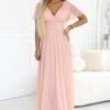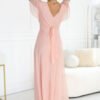 This peach maxi dress with a delicate sheen gives a wow effect from the first moment – it slims the silhouette, accentuates the waist, and moves beautifully. The V-neck wrap adds lightness to the top, and the flowing sleeves gently lay on the shoulders. Perfect when you want to look elegant and feel comfortable all day and evening. Peach, tulle maxi dress with a wrap neckline and subtle glittering sheen beautifully accentuates the waist and amazes with lightness in movement. Perfect for a wedding, ball, prom, and elegant receptions.