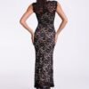 Long dress with fitted cut without sleeves. Dress is trimmed entirely with lace.