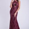 Long sexy sleeveless dress with deep neckline. Dress covered with burgundy lace. Perfect for an evening out.