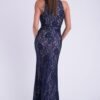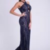Long sexy sleeveless dress with deep neckline. Dress covered with navy blue lace. Perfect for an evening out.