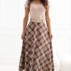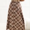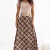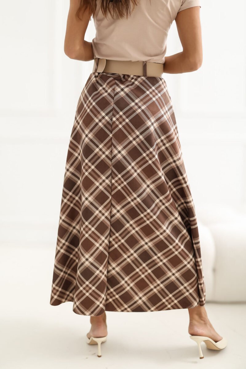 Stylish maxi skirt with a flared cut, which will work perfectly in both everyday stylizations and work outfits. The model stands out with a classic check pattern, giving the whole an elegant and timeless character. The skirt has a comfortable elastic band sewn into the waist, which allows it to fit well to the silhouette and provides comfort for wearing throughout the day. An additional element is a fastened belt that emphasizes the waist and is a stylish addition to the model. The maxi length and flared cut make the skirt beautifully fall during movement, giving the styling lightness and a feminine character. Made of a material that is a combination of polyester and elastane, it is durable, slightly elastic, and comfortable to use. The model without fastening ensures quick and easy putting on.