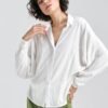 This oversize cut shirt is a unique choice for women who want to combine a fashionable look with comfortable wear. Made of lightweight viscose, this ecru-colored shirt is eye-catching and perfect for summer days. Its oversize cut provides a loose and casual look, perfect for casual, casual outfits. The classic collar adds elegance to the shirt and contrasts with the loose cut, creating a harmonious whole. The long bat sleeve gives the shirt an original touch, while the cuffs add structure and a stylish finish. The front button closure makes the shirt easy to put on, while adding a light and casual feel. The back stitching in the middle is a subtle detail that adds a unique charm to the shirt. This element adds structure to the shirt, while remaining a discreet and elegant accent. This shirt is an excellent choice for women who appreciate comfort and casualness combined with fashionable, unconventional style. Perfect for summer days to feel comfortable while looking stylish and fresh.