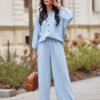 Blouse with a loose fit and voluminous sleeves. Fastened at the front with buttons, allowing for neckline adjustment. Shirt-like cut, slightly elongated back.