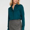 Classic women’s shirt with a regular cut made of pleasant to the touch viscose is a must-have in an elegant wardrobe. The model has a collar and long sleeves with cuffs that give it a stylish character. The shirt is fastened with buttons hidden under a covered pleat, which emphasizes its minimalist, timeless style. Thanks to its simple cut, it goes well with both elegant trousers or a skirt, as well as in more casual outfits.