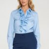 Women’s fitted shirt, elegantly emphasizing the silhouette. Equipped with a classic collar and long sleeves, it is a timeless base for styling. The model is buttoned up, enriched with a fancy, decorative jabot, which gives the whole a unique, feminine character. An ideal proposition for both the office and special occasions, where style and subtle elegance matter.