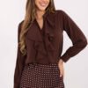 Classic women’s shirt that combines elegance with timeless style. Made of high-quality blend of polyester and elastane, it provides comfort, excellent fit, and freedom of movement throughout the day. The model has long sleeves and a stand-up collar, and the button fastening gives it a classic character. The attention is drawn to the frill on the front, which subtly decorates the shirt, adding feminine charm and elegance to it. The smooth fabric and standard length make the shirt perfect for both work and for formal or casual occasions.