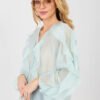 An elegant collarless women’s shirt is a stylish proposal that perfectly combines classic with modern lightness. It will work perfectly for formal occasions, for work, as well as in everyday, elegant stylings. The smooth pattern gives it a timeless character and makes it easy to combine with other wardrobe pieces. The shirt is made of high-quality tencel with added elastane, which ensures softness, breathability, and comfort for all-day wear, while also providing a delicate fit to the silhouette. The standard length makes the model look great both worn in pants and loosely. The model has long, puffy sleeves, which add a feminine and elegant expression to the whole. The V-neck subtly accentuates the neck and slims the silhouette. The button closure emphasizes the classic character of the shirt, while the ruffles on the front and sleeves are a striking, decorative accent, giving the shirt lightness and a unique style. It is the perfect choice for women who appreciate elegance, comfort, and well-thought-out details.
