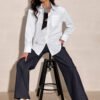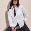 The shirt with a loose, modern cut was designed with comfort and universal style in mind, perfect for everyday wear. The model stands out with its timeless form, careful finishing, and subtle shoulder pads that add definition to the silhouette. The shirt is buttoned and was produced in Poland with a focus on quality and details. It looks great in casual stylings with denim shorts and sneakers, as well as in a more feminine version, paired with fitted trousers and high heels.
