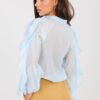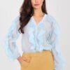 An elegant women’s shirt without a collar is a stylish proposal that perfectly combines classic with modern lightness. It will work perfectly for formal occasions, for work, as well as in everyday, elegant stylizations. The smooth pattern gives it a timeless character and makes it easy to combine with other wardrobe items. The shirt is made of high-quality tencel with elastane, which ensures softness, breathability, and comfort for wearing all day, while also providing a delicate fit to the silhouette. The standard length makes the model look great both worn in pants and loosely. The model has a long, puffy sleeve, which adds a feminine and elegant expression to the whole. The V-neck subtly emphasizes the neck and slims the silhouette. The button closure emphasizes the classic character of the shirt, while ruffles on the front and sleeves are a striking, decorative accent, giving the shirt lightness and a unique style. This is the perfect choice for women who appreciate elegance, comfort, and well-thought-out details.