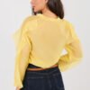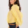 An elegant women’s shirt without a collar is a stylish proposal that perfectly combines classic with modern lightness. It will work perfectly for formal occasions, for work, as well as in everyday, elegant stylizations. The smooth pattern gives it a timeless character and makes it easy to combine with other wardrobe items. The shirt is made of high-quality tencel with added elastane, which ensures softness, breathability, and comfort throughout the day, while at the same time delicately fitting the silhouette. The standard length makes the model look great both worn in trousers and loosely. The model has long, puffy sleeves, which add a feminine and elegant touch to the whole look. The V-neck subtly accentuates the neck and slims the silhouette. The button closure emphasizes the classic character of the shirt, while ruffles on the front and sleeves are a striking, decorative accent, giving the shirt lightness and a unique style. It is the perfect choice for women who appreciate elegance, comfort, and well-thought-out details.