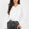 Casual women’s shirt with a classic, everyday character, combining comfort with subtle details. Made of soft cotton, it ensures wearing comfort and freedom of movement. The model with a smooth pattern has long sleeves that can be rolled up, allowing the shirt to be adjusted to weather conditions and styling. An elegant collar and button fastening at the front add a timeless look to the shirt, while a practical chest pocket emphasizes the casual style. The back of the shirt is decorated with a decorative pleat, giving the whole outfit lightness and subtle character. The standard length makes the shirt perfect for both jeans and skirts, creating a versatile everyday look.
