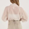 Women’s shirt in a classic cut, which will work perfectly for everyday wear, for work, as well as for more formal occasions. The model of standard length, buttoned, combines timeless elegance with modern details. Made of a comfortable blend of lyocell and polyester, it provides comfort and durability. The fabric is adorned with a subtle pattern of fine stripes, which adds lightness and stylish character to the whole. The shirt stands out with puffy sleeves ending with wide cuffs, which give the silhouette expressiveness. An additional advantage is the tie at the neck, allowing you to create an elegant bow or tie it casually depending on the occasion.