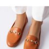 Brown decorative moccasins by Lejeune are the perfect choice for the upcoming summer. Made of synthetic leather, they have a flat sole and a rounded toe. Decorated with a characteristic stitching and small zircons at the front, they add elegance and originality. The interior of the moccasins is lined with soft foam, ensuring comfort when wearing. The universal brown color makes them suitable for many stylizations, and standard numbering makes it easier to choose the right size. Ideal for narrow feet. The slip-on closure makes it easy to put on and take off quickly. Perfect for summer walks or meetings with friends.
