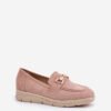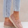 Women’s moccasins made of eco-suede. Set on a delicate platform with a jute braid. The front is decorated with a gold detail that adds elegance. Rounded toes. This model is not only stylish, but also functional thanks to the perforated upper that allows the foot to breathe. Perfect for many spring stylings!