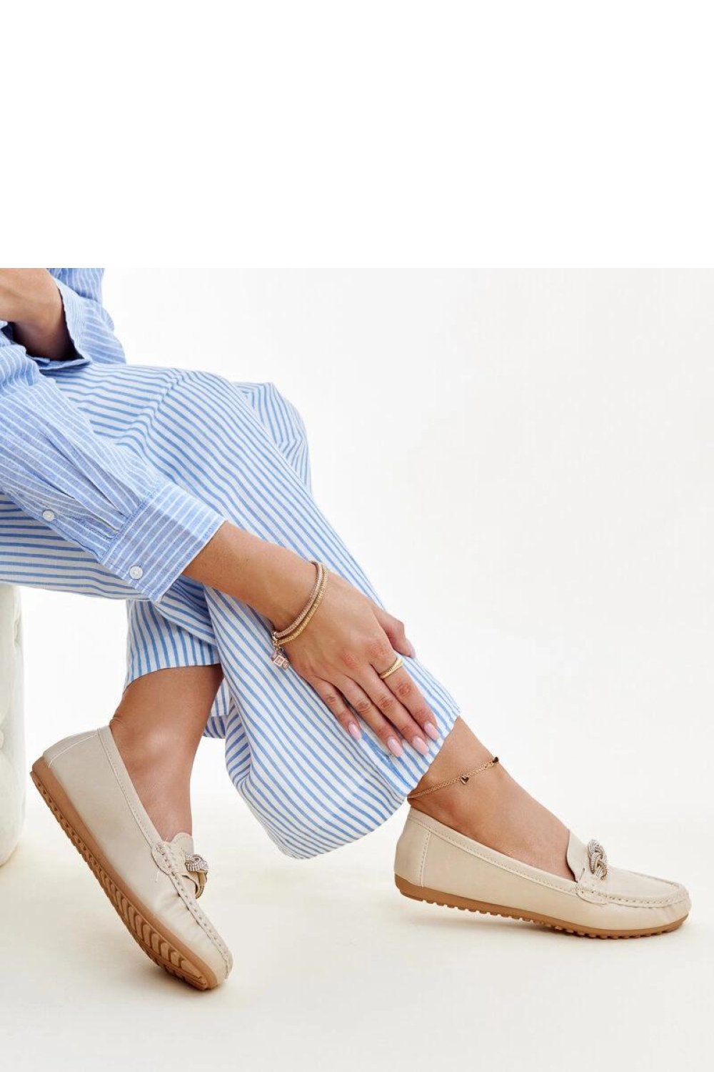 Stylish women’s moccasins made of soft, suede-like eco leather. The classic design with a round toe gains an elegant character thanks to shiny zircons placed on the front, which give the shoes a subtle charm. Slip-on model, comfortable for everyday use, set on a stable 3.5 cm heel. The eco leather insole enhances comfort, and the low cut makes the shoes perfect for many stylizations, both casual and more elegant. Ideal for women who appreciate comfort combined with a touch of stylish glow.