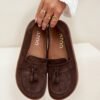 Women’s barefoot moccasins are a proposal for those who appreciate natural comfort and freedom of movement. Made of soft, natural suede, they perfectly fit the shape of the foot, providing a pleasant feeling of lightness and comfort when worn. At the front, the upper is adorned with a strap with two tassels, which add a touch of subtle charm and stylish character to the whole. These are perfect everyday shoes that will work well in casual, casual stylizations, as well as in more elegant outfits.