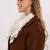 Elegant and feminine triangular scarf with a varied texture of material, made of delicate viscose, which is pleasant to the touch and lightweight. The model, 52 cm long and 152 cm wide, fits perfectly on the shoulders, adding style to any outfit. The scarf is adorned with lace details and fringe with pearls, giving it a subtle, romantic character. Perfect for everyday wear, as well as for special occasions, it will beautifully complement both an elegant coat and a casual jacket.
