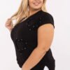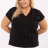 Women’s plus size casual blouse is the perfect choice for everyday wear, as well as for work. Made of soft cotton with elastane, it provides comfort and perfect fit to the silhouette. The model is of standard length, with short sleeves and a feminine v-neckline that subtly accentuates the neck. The eye-catching application on the front in the shape of hearts adorned with sparkling zircons attracts attention, adding an elegant and delicate charm to the blouse. Great for everyday styling, it will work well with jeans as well as more classic trousers or a skirt. Universal, comfortable and with character, ideal for work and for more relaxed meetings.