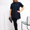 Extended casual blouse, perfect for everyday occasions. Made of pleasant to the touch cotton with elastane, making it soft, elastic and comfortable to wear all day long. The smooth pattern makes the blouse easy to match with many stylizations. The model has a round neckline and short sleeves, giving it a universal, casual character. The lack of fastening emphasizes the simple, comfortable form. An additional advantage is the ruffle at the bottom back, which subtly enlivens the silhouette and adds a feminine charm. An ideal proposition for everyday wear with jeans, leggings or a skirt.