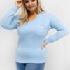 Plus size blouse with a classic, everyday character is an excellent base for many stylizations. The smooth pattern gives it universality, making it easy to match with both jeans, material pants, or leggings. The standard length ensures that the blouse fits well on the silhouette and provides comfort throughout the day. The model is made of exceptionally soft micro modal with a touch of elastane, which is pleasant to the touch, breathable, and elastic. Long sleeves and a V-neck subtly emphasize the neck and neckline, adding lightness to the whole. The blouse does not have a fastening, which increases the comfort of use. A stylish accent is the pocket at chest height decorated with a decorative patch, which breaks the simple form and gives the blouse a modern character.