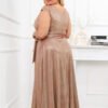 The elegant, shimmering dress in a shade of dark gold is a perfect choice for special occasions. Made of delicately shimmering material, it gives the styling a subtle glow and a luxurious look. The wrap V-neck beautifully accentuates the bust, and the tie at the waist shapes the silhouette, emphasizing its assets. The flared bottom with a striking slit adds lightness and sensuality to the dress. The model is fastened with a concealed zipper, ensuring comfort and perfect fit to the figure. Ideal for weddings, balls, receptions, and other celebrations.