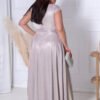 The elegant, shimmering dress in a champagne lilac shade is a perfect choice for special occasions. Made of delicately shimmering material, it gives the styling a subtle glow and a luxurious look. The wrap V-neck beautifully emphasizes the bust, and the tying at the waist models the silhouette, emphasizing its assets. The flared bottom with a striking slit adds lightness and sensuality to the dress. The model is fastened with a concealed zipper, providing comfort and perfect fit to the figure. Ideal for weddings, balls, receptions, and other celebrations.