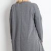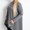 Stylish plus size tunic with an elongated, asymmetrical cut is a perfect choice for women who value comfort and a modern look. Made of soft, pleasant to the touch material, it beautifully drapes on the silhouette, providing freedom of movement and subtle slimming of the figure. The model combines the tunic style with an asymmetrical dress, making it perfect for leggings as well as a loose standalone dress. The classic, round neckline accentuates the neck and fits any styling. Long sleeve, perfect for cooler days. Practical pockets hidden in the side seams add convenience and functionality. At the front, at the bottom, there is a small patch adding a trendy character to the whole. The tunic is put on over the head, ensuring quick and comfortable dressing. Modern, comfortable, and stylish, it will perfectly complement everyday stylings, and its elongated, asymmetrical cut will beautifully emphasize the advantages of a plus size silhouette.