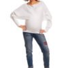 Short oversize maternity sweater. Bottom and sleeves finished with ribbing. Boat neckline, long sleeves. Kimono cut masks a growing belly. A wide neckline lets you flirtatiously uncover your shoulder. Sweater made of soft and pleasant to wear yarn with a delicate weave.