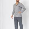 Classic unbuttoned men’s pajamas. The pajama top is brightly colored with a subtle pattern printed on it. The blouse has three practical pockets trimmed with contrasting trim. Satin piping in the color of the pants emphasizes the elegant character of these pajamas. The long pants have a straight, loose fit.