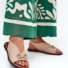 Elegant sandals made of eco leather are the perfect choice for summer days, combining style and comfort. At the front of the shoes there is a decoration that adds a unique charm to them. Set on a flat heel, they provide comfort throughout the day. Fastened with an adjustable buckle strap, they allow for a perfect fit. These sandals will be a great addition to dresses, skirts, and fabric pants, creating an elegant and fashionable look.