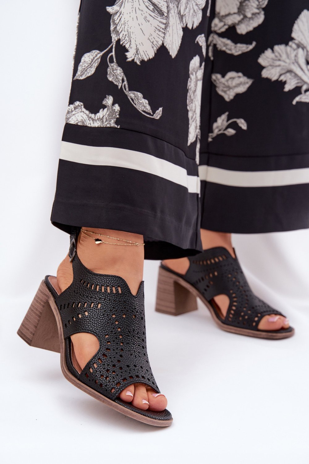 Elegant eco leather sandals are a perfect choice for summer days, combining style and comfort. There is a decoration at the front of the shoes that adds a unique charm to them. Set on a flat heel, they provide comfort throughout the day. Fastened with an adjustable buckle strap, they allow for a perfect fit. These sandals will be a perfect complement to dresses, skirts, and fabric pants, creating an elegant and fashionable look.