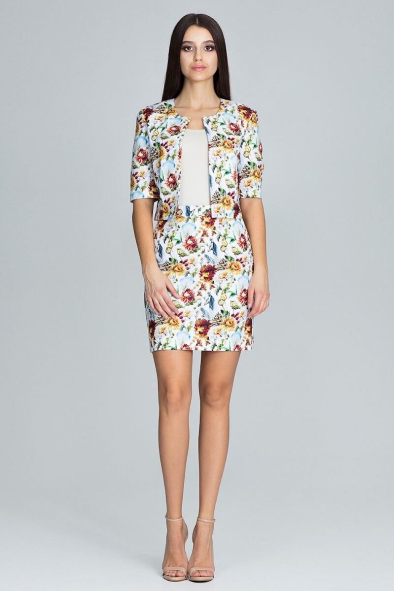 Great set with floral patterns. Skirt before the knee and a jacket with 3/4 sleeves is a great proposition for a fashionable woman. Lightweight material adds elegance and comfort of use.