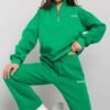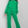 A set consisting of a sweatshirt and sweatpants. Blouse with long sleeves and a pocket on the front. Trousers with pockets and tie at waist.