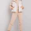 A set consisting of a sweatshirt, sweatpants and a down vest. Zipped vest with pockets. Straight cut sweatshirt with long sleeves and a hood. Sweatpants with pockets and tie at the waist.