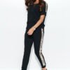 Light and airy women’s sweatshirt set with a short sleeve blouse. A perfect set for work, a shopping frenzy or a meeting with friends. The oversize women’s sweatshirt has a tightly cut round neckline that exposes the collarbones. Decorative gold ribbons with the word Numinou are present on both sides of the sleeves. The set also comes with women’s sweatpants with ribbing sewn into the distal part of the legs and at the waistline. The sides of the pants have the aforementioned gold ribbons sewn in, which are a reference to the aforementioned blouse. There are side slip pockets on the hip line. The knitwear of the set is extremely pleasant to wear.