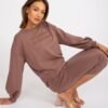 Tracksuit set consisting of a skirt and sweatshirt. Blouse with long sleeves, put on over the head. Skirt with tie belt, side pockets.