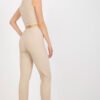 A set consisting of a top and long pants. Short top with round neckline. Long pants with high waist and straight legs, with an elastic band at the waist. The whole is made of a wide ribbed fabric.
