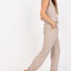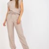Summer set consisting of a blouse and long pants. Blouse in a classic cut with a fastening at the neck. Long pants with an elastic waistband and binding, with slip pockets on the sides.