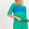 A set consisting of a blouse and shorts. Blouse with short sleeves and round neckline. High-waisted shorts, with a tie at the waist and slip pockets on the sides.