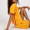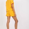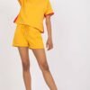 A set consisting of a blouse and shorts. Blouse with short sleeves and round neckline. High-waisted shorts, with a tie at the waist and slip pockets on the sides.