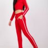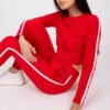 A set consisting of a sweatshirt and long pants. Short blouse with long sleeves and a round neckline. On the sleeves there is a contrasting striped pattern. Long pants of matching cut with slip pockets.