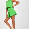 A set consisting of shorts and a top. Shorts with a high waist, wide legs and an elastic waistband. Sleeveless shirt, decorative binding on the back.