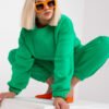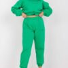 A sweatshirt set consisting of a sweatshirt and long pants. Short sweatshirt with long sleeves, round neckline. Long pants with high waist, binding and elastic waistband, slip pockets on the sides.