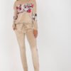 Velour set consisting of a sweatshirt and long pants. Sweatshirt with long sleeves and a hood. Long pants with waist tie and slip pockets. Set with decorative floral inserts.
